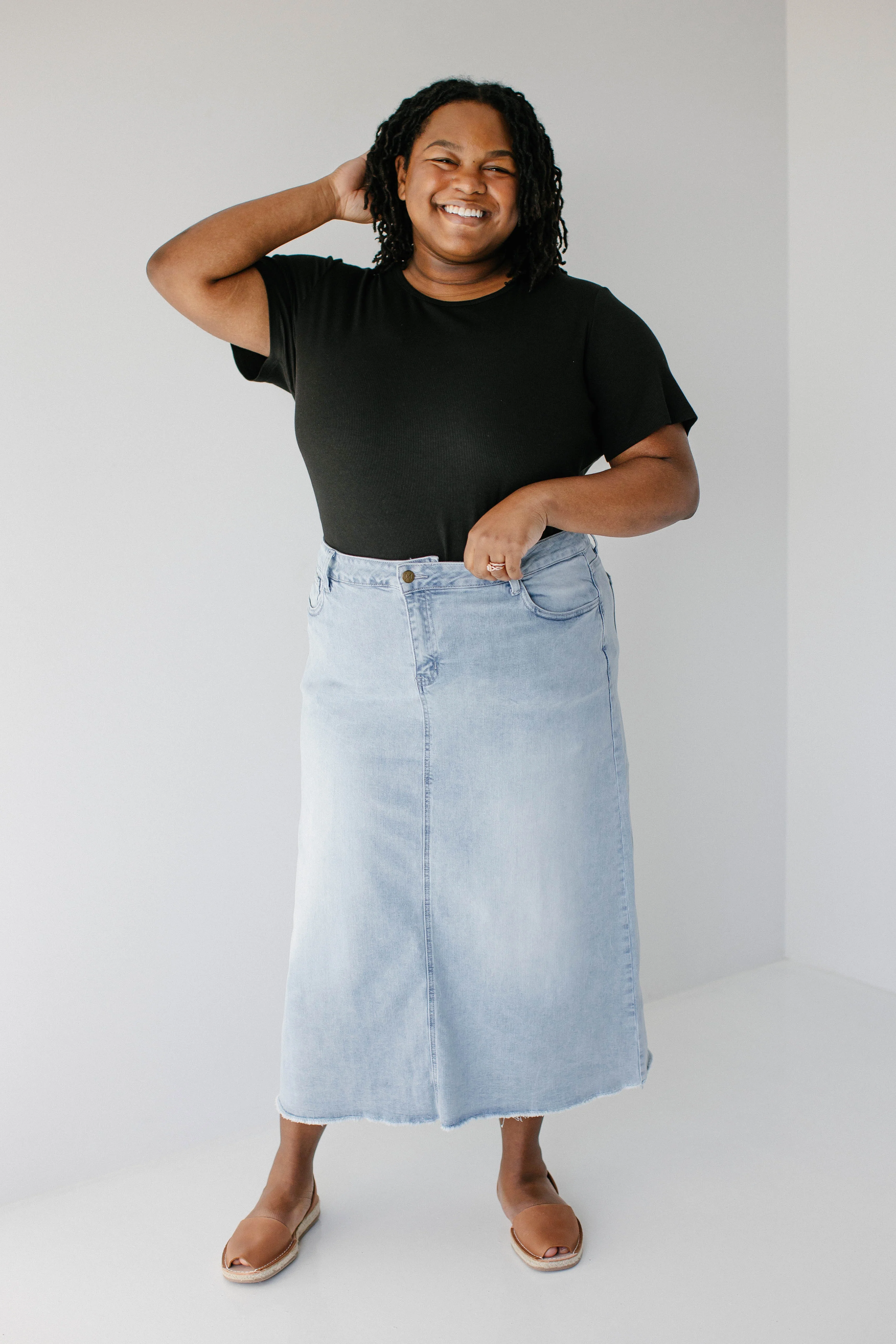 Your new go-to denim skirt is here! The 'Laura' is an essential light wash denim midi skirt that completes any outfit. The skirt is a petite length, making it perfect for the women that are not as tall. The denim is soft, comfortable, and has a bit of stretch! Transition this piece into any season of the year, the styling options are endless! Perfect for everyday wear, a walk in the park, running errands, or elevated for church! Exclusively designed with you in mind.