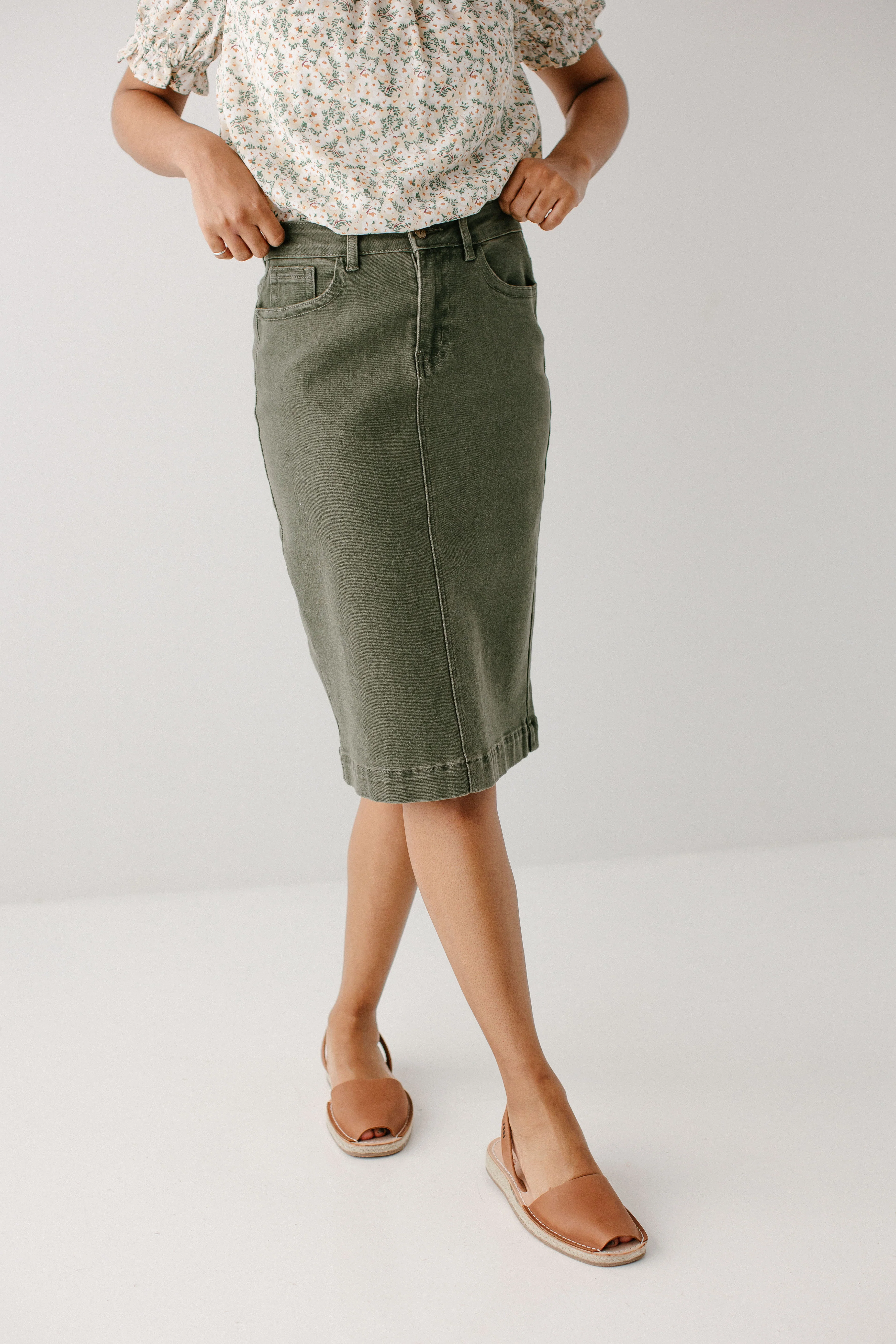 Our bestselling 'Leah' Skirt is here in a beautiful olive shade! Modesty. Comfort. Style. This denim midi skirt has it all... stretch, cotton fabric and a timeless button-fly closure! We love that the simple lines of the 'Leah' skirt add a touch of class to any outfit. Designed by us with you in mind, we think you are going to fall in love with this skirt as much as we did!
