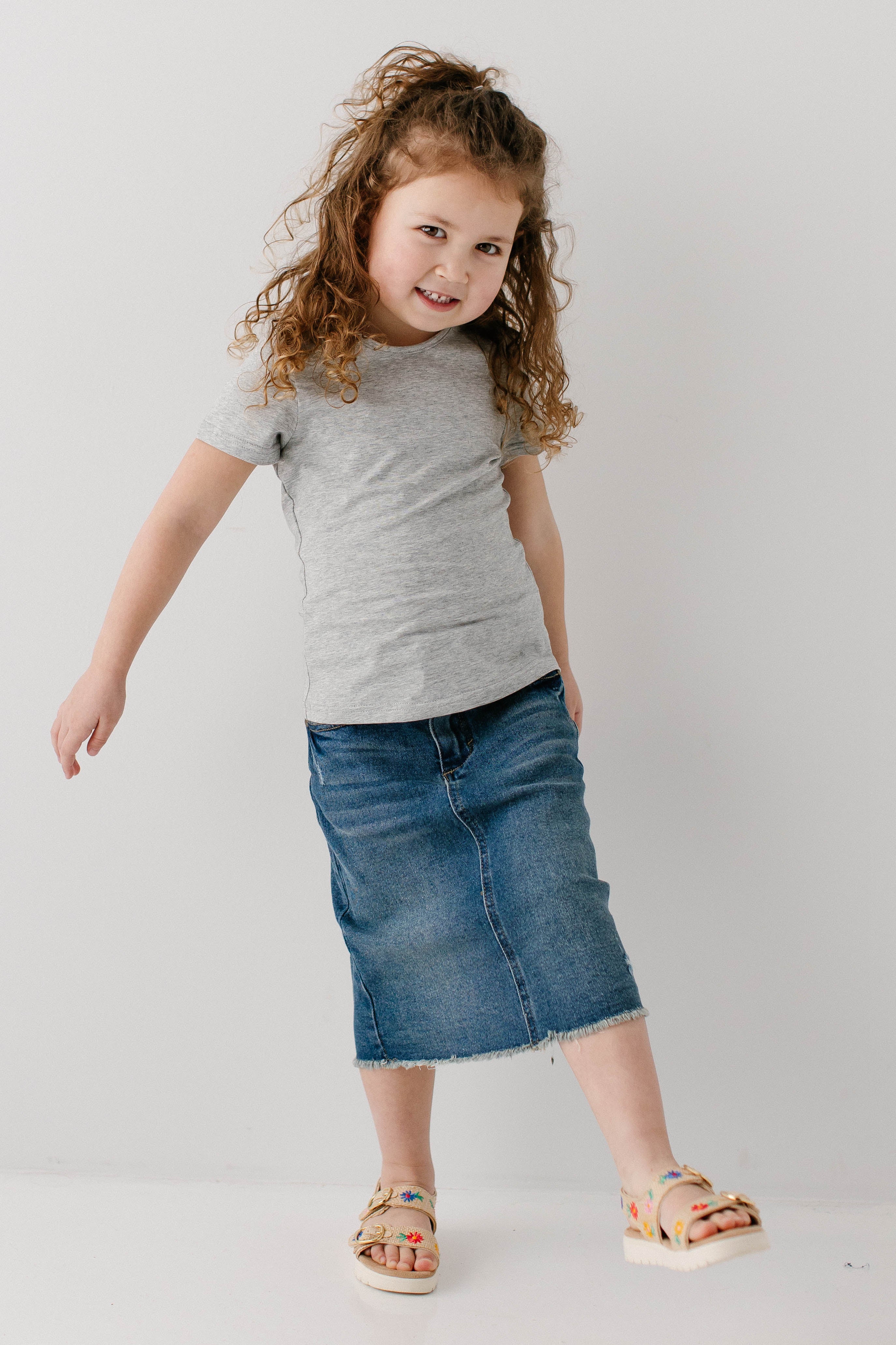 From the classroom to hanging out with friends - this cute and comfy denim skirt is up for the adventure! The 'Nala' is made from a quality denim with just the right amount of stretch for all day comfort. It has functional pockets, the perfect amount of distressing, and a modest below-the-knee length. Featuring an adjustable waistband for a secure fit through growth spurts! Exclusively designed by us for you.