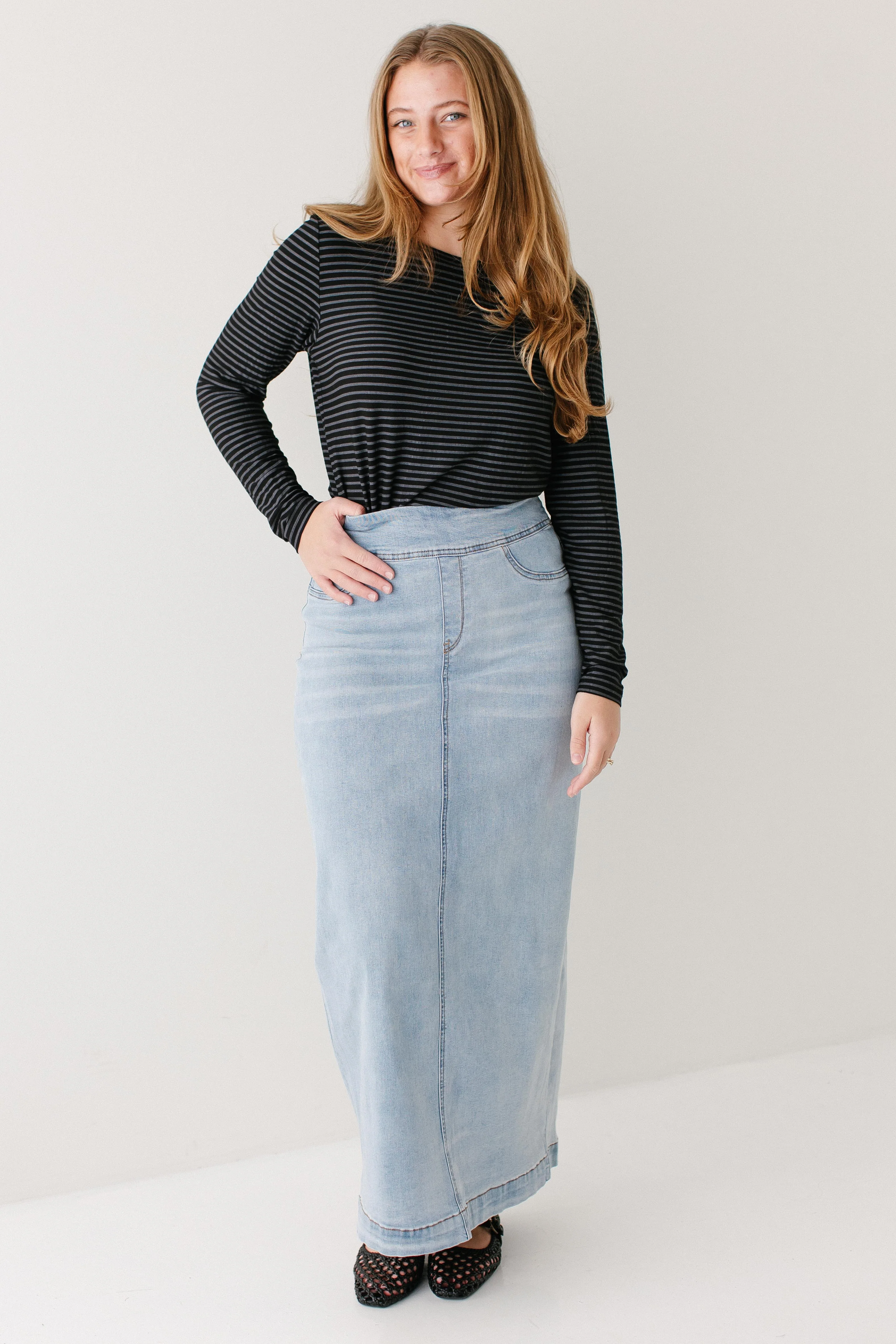 'Sara' Classic Long Stretch Denim Skirt